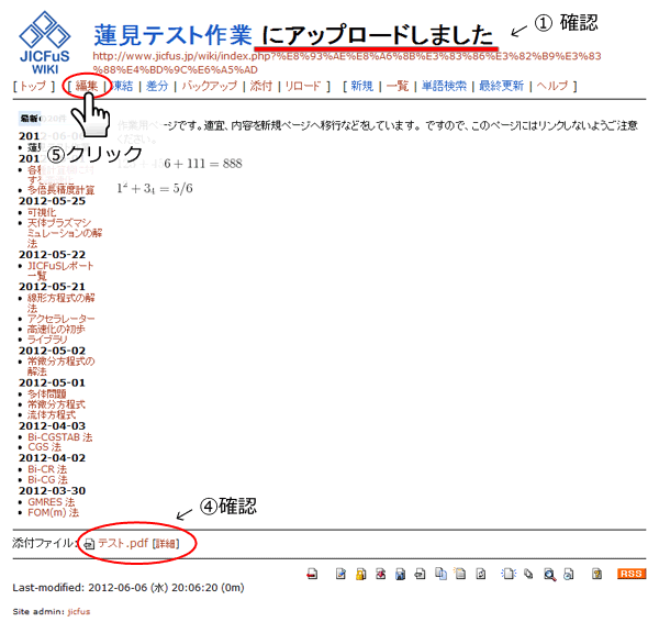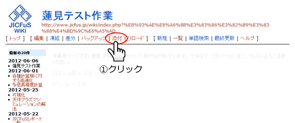PDFへリンクを張りたいページ(この場合は「蓮見テスト作業」)の「添付」をクリックする