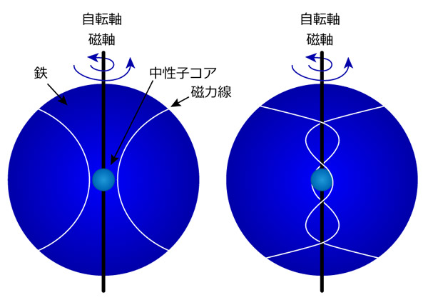 どんな星にも磁場があり、星を1本の棒磁石と見なすことができます。これを磁軸といいます。磁軸と自転軸がほぼ同じで、鉄が磁力によってお互いに引き合い、磁力線に沿って並んでいるとしましょう。そうすると、外側の鉄よりも、内側の鉄の方が速く回転するので、磁力線が自転軸の周りにグルグル巻かれて密になります※。それはバネが押し縮められているのと同じ状態です。星の磁場が強く、自転が速いとバネがどんどん押し縮められ、いずれ反発して自転軸方向に爆発することになります。