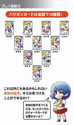 クォークカードを交換して、バリオンカードやメソンカードをゲットしよう! 赤・緑・青の三原色をそろえるとバリオンカードが、補色同士の2枚をそろえるとメソンカードが手に入る。キミは何枚のカードをゲットできるか!